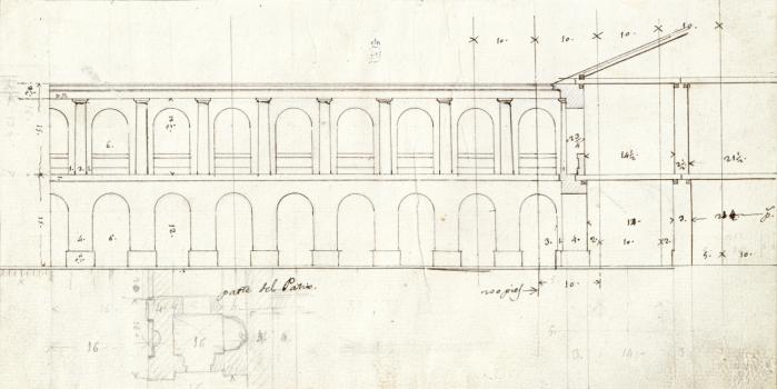 Alzado y sección del patio del convento de PP Agustinos en América. En: Trazas, rasguños y diseños del arquitecto Silvestre Pérez