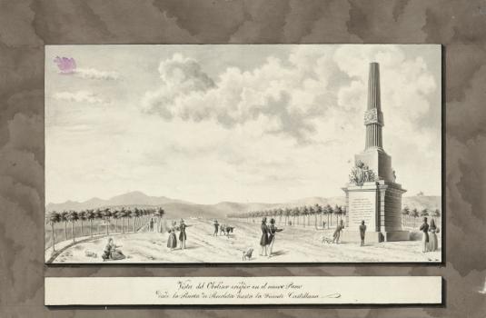 Vista del Obelisco erigido en el nuevo Paseo desde la Puerta de Recoletos hasta la Fuente Castellana . [1833]