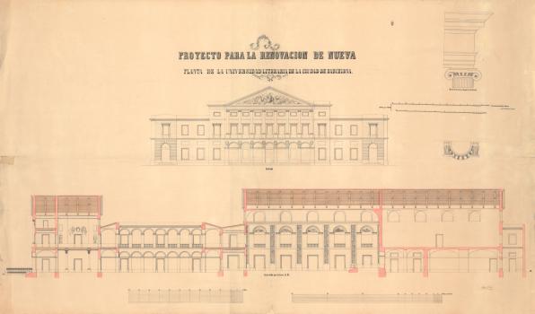 Proyecto para la renovación de nueva planta de la Universidad Literaria de Barcelona. Fachada, corte, detalle del cornisón y capitel . [1854]