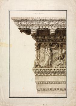 Ángulo de un cornisamento romano de orden corintio inspirado en los Trofeos Farnesio. [1780-1810]