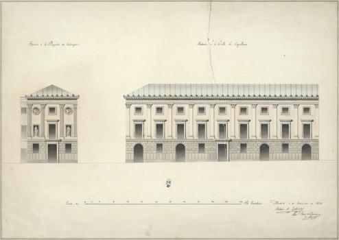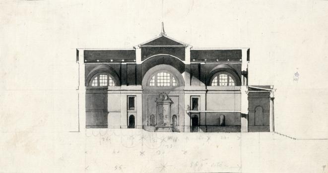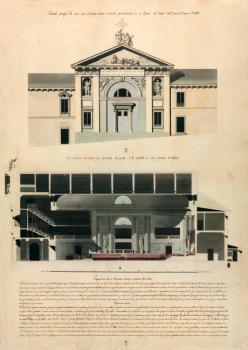 Proyecto del Salón para el Congreso de Cortes. Alzado principal y sección longitudinal. [1820]