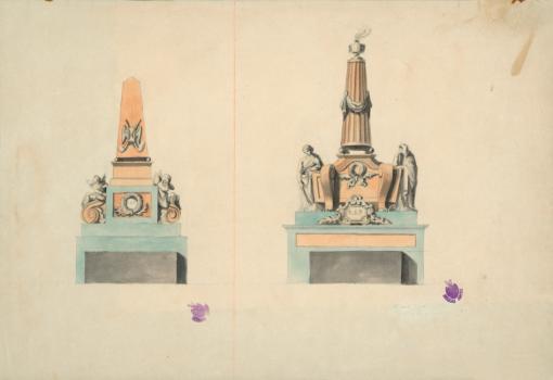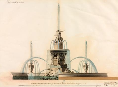 Proyecto de una fuente monumental para el parterre del Retiro en memoria del regreso de la reina madre María Cristina de Borbón . [18--]