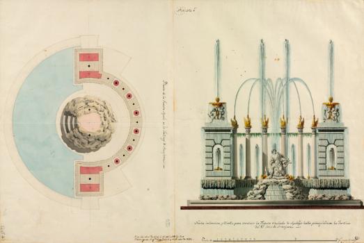 Media planta y alzado de la Fuente de Ceres. [1837]