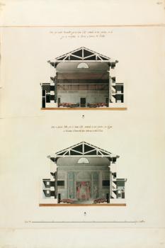 Proyecto del Salón para el Congreso de Cortes. Secciones transversales hacia la tribuna y hacia el dosel del trono. [1820]