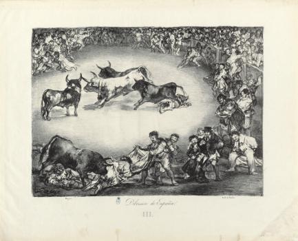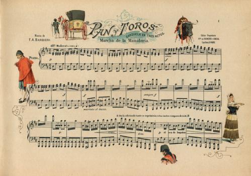 Pan y toros. Marcha de la manolería. Litografía sobre acuarela de Daniel Perea (1893)