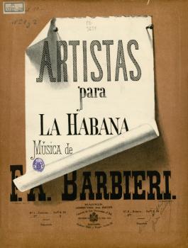 Artistas para La Habana. Comedia en un acto de los señores Liern y Mádan (1877). Cubierta ilustrada en color por L. Taberner.